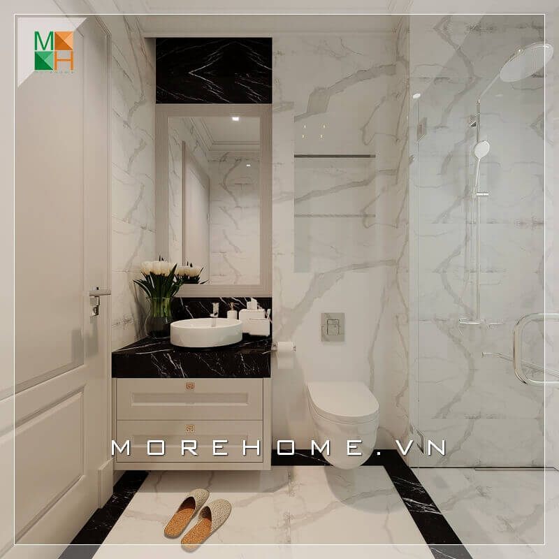 Tủ kéo gỗ được thiết kế thông minh và phù hợp với thiết kế tổng quan của căn phòng để chứa đồ dưới bồn rửa. Màu sắc của nó được lựa chọn để tương đồng với tone màu chính của phòng tắm, đó là trắng.