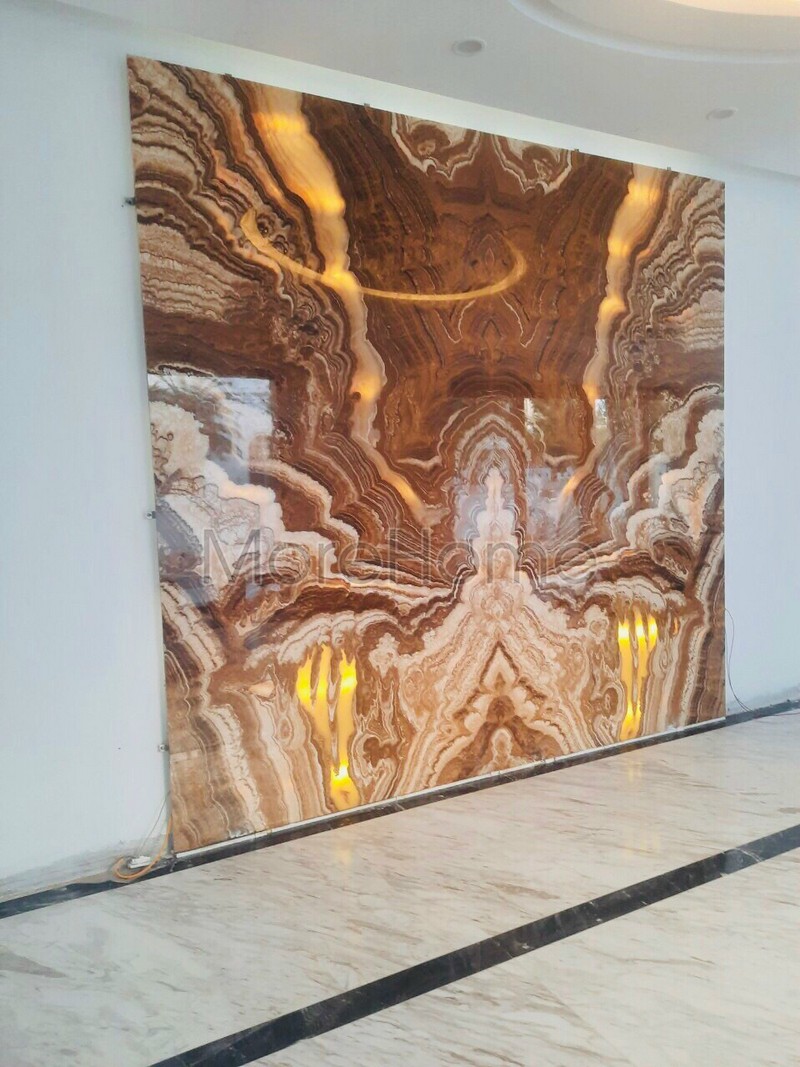 Bạn có thể dùng đá onyx để tạo thành những bức tranh đá sống động trên tường cùng với việc kết hợp các loại đèn trang trí như đèn chiếu rọi, đèn hắt… tạo nên sự hiện đại, trang trọng.