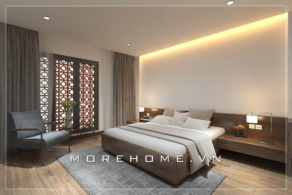 Giường ngủ gỗ công nghiệp màu nâu ấn tượng tạo điểm nhấn cuốn hút mang lại cho không gian phòng ngủ vợ chồng cảm giác ấm cúng và lãng mạn