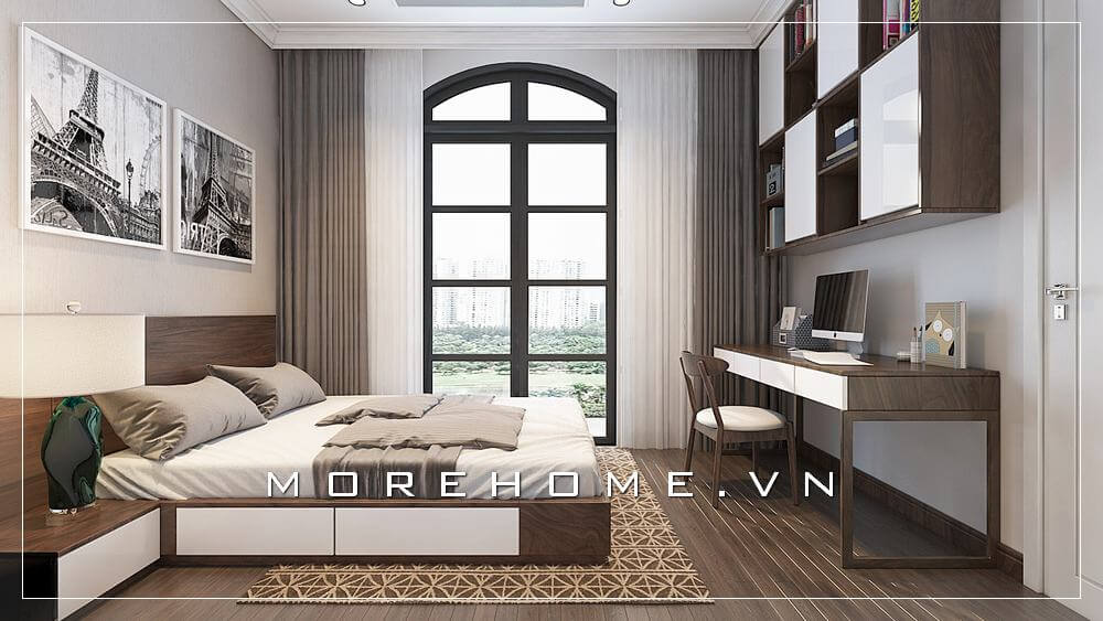 Giường ngủ gỗ công nghiệp màu nâu chủ đạo được lựa chọn làm điểm nhấn nổi bật cho cả căn phòng ngủ chung cư hiện đại